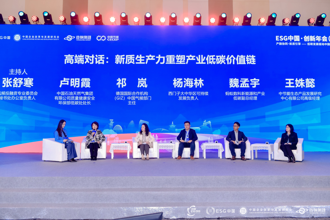 “智汇研析”环节,中节能衡准公司副总经理白红春系统解析了ESG如何从信息披露走向财务价值。高端对话环节,来自能源央企、国际机构、科技企业与智库等领域的五位专家展开深度对话与思想碰撞,从多元视角共探新质生产力驱动产业低碳转型的实践路径。