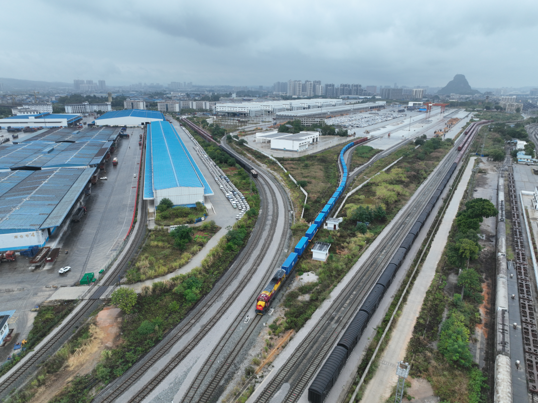 “柳州—钦州—东盟”铁海联运专列发车航拍图。北部湾港集团供图