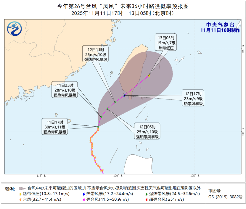 ■ 中央气象台11日18时发布台风黄色预警,今年第26号台风“凤凰”已于11日下午减弱为强热带风暴级。“凤凰”将以每小时10公里左右的速度向北偏东转东北方向移动,强度逐渐减弱,并将于12日傍晚前后在台湾岛西南部沿海再次登陆(热带风暴级,8-9级,20-23米/秒),之后快速减弱。