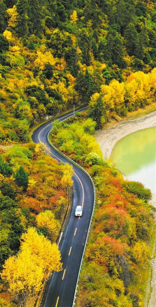 10月31日,汽车行驶在雅鲁藏布江沿线公路,道路两旁的树木被秋色浸染。扎西洛布摄(中经视觉)