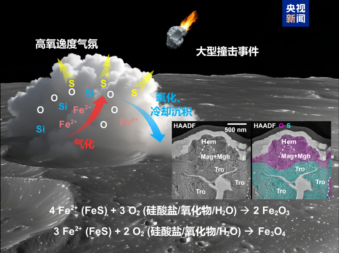 研究提出,赤铁矿的形成可能与月球历史上的大型撞击事件密切相关。大型撞击形成瞬时高氧逸度气相环境的同时,铁元素在高氧逸度环境中被氧化,使陨硫铁发生了脱硫反应,经气相沉积过程形成微米级晶质赤铁矿颗粒。值得关注的是,该反应的中间产物为具有磁性的磁铁矿和磁赤铁矿,可能是南极-艾特肯盆地边缘磁异常的矿物载体。该研究首次利用样品证实了在超还原背景下月球表面存在赤铁矿等强氧化性物质,揭示了月球的氧化还原状态以及磁异常成因。