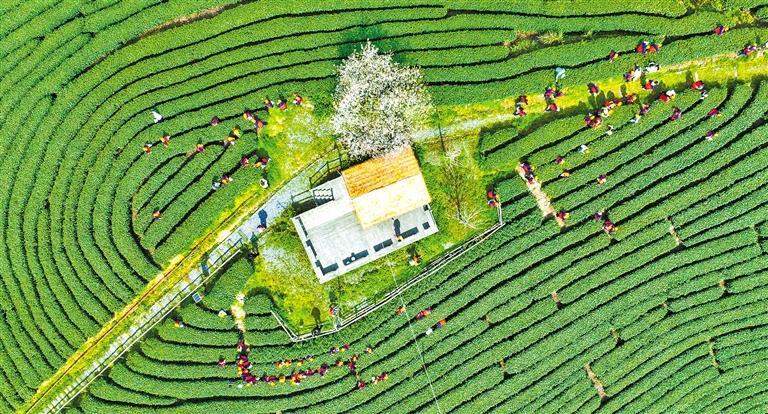 4月2日拍摄的淳安县枫树岭镇春季茶山景色。淳安县现有茶园18.8万亩,可采茶园17万亩,2024年茶叶产值11.64亿元。