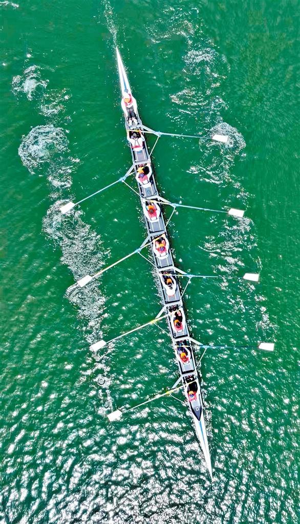 4月13日,运动员在2025中国·千岛湖赛艇马拉松公开赛上展开角逐。近年来,淳安县通过举办高水平体育赛事激活区域经济,成功打造“体育+旅游”融合发展模式。