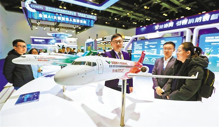 11月18日,工作人员在2025中国国际应急管理展览会上介绍中国商飞C909灭火机模型。