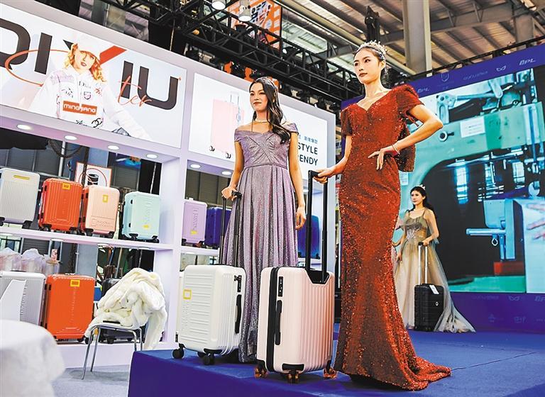 11月14日,湖南省第五届永州·蓝山国际皮具箱包博览会现场,模特在展示箱包。