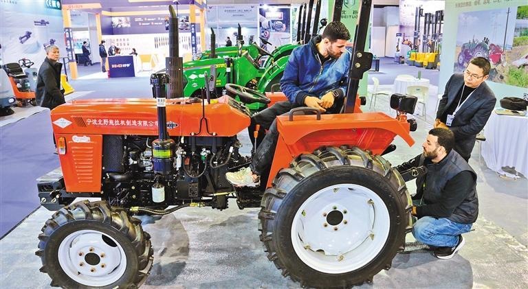11月20日,2025浙江义乌国际智能装备博览会新型农机装备展区,国外客商在选购新款拖拉机。